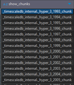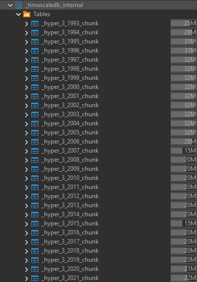 The chunk tables are stored in the _timescaledb_internal schema. In the image below, we see that the chunk tables are created.
