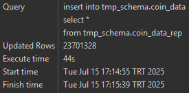 SELECT create_hypertable('tmp_schema.coin_data', by_range('transaction_time', INTERVAL '1 week'),migrate_data => true);We inserted the previously stored data from the regular table into the hypertable.